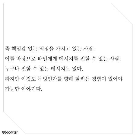 μ¦ μ± μκ° μλ μ΄μ μ κ°μ§κ³ μλ μ¬λ. μ΄λ₯Ό λ°νμΌλ‘ νμΈμκ² λ©μμ§λ₯Ό μ ν μ μλ μ¬λ. λꡬλ μ ν μ μλ λ©μμ§λ μλ€. νμ§λ§ μ΄κ²λ 무μμΈκ°λ₯Ό ν₯ν΄ λ¬λ €λ κ²½νμ΄ μμ΄μΌ κ°λ₯ν μ΄μΌκΈ°λ€.